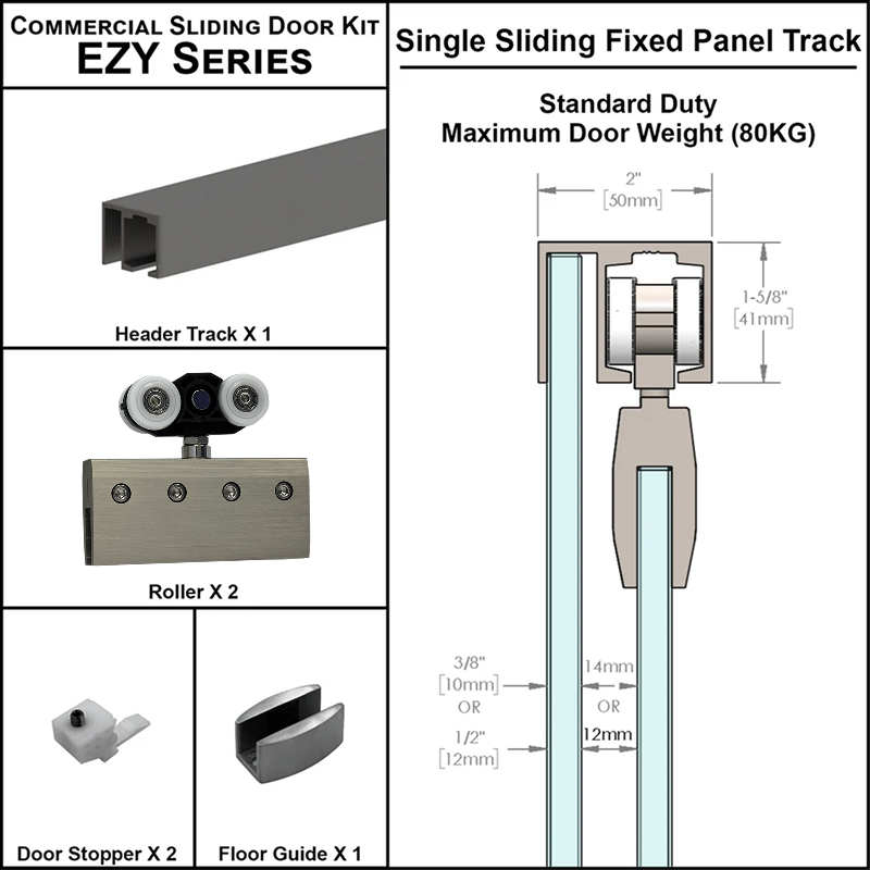 The GGH EZY1 Single Sliding Door Kit with Fixed Panel is designed for regular-duty use, supporting up to 80 kg of weight. It is compatible with 3/8" to 1/2" (10 mm to 12 mm) monolithic tempered glass, making it perfect for applications that require both a sliding door and a fixed glass panel. This kit is easy to install with no need for glass drilling, ensuring a quick and hassle-free setup. It is highly versatile, ideal for applications such as office partitions, wine rack enclosures, wardrobe doors, shower enclosures, pantry dividers, or modern space partitions.